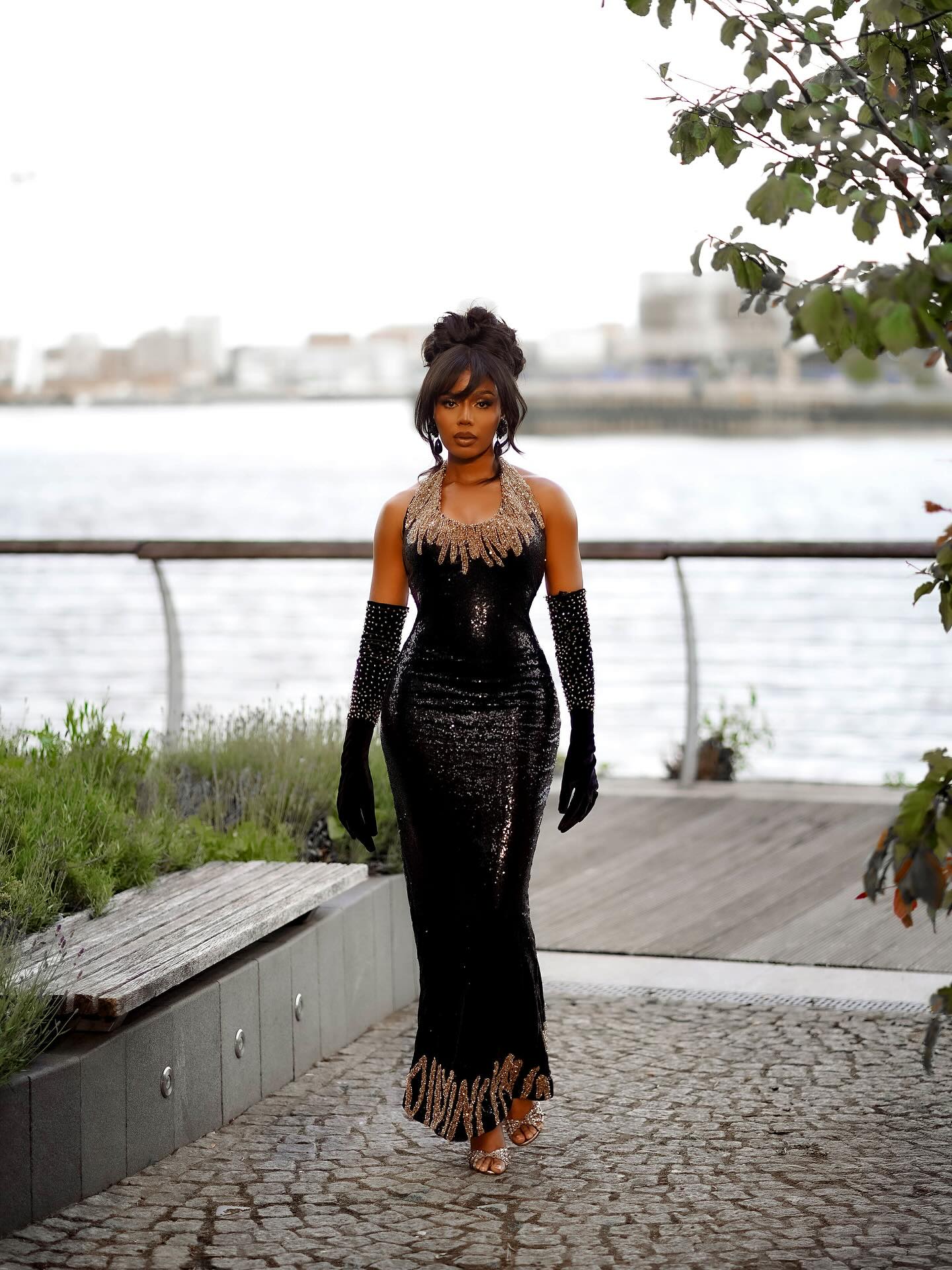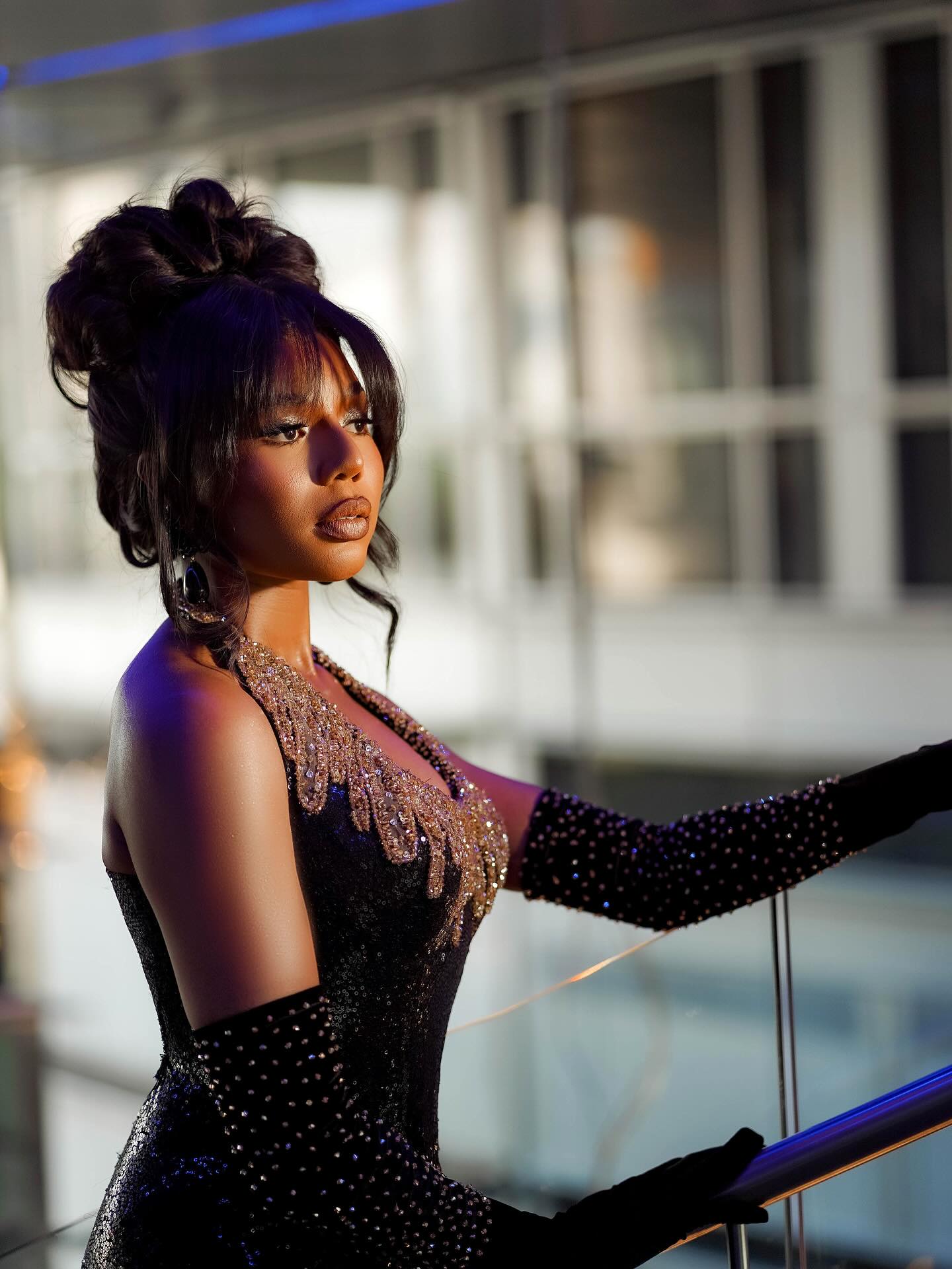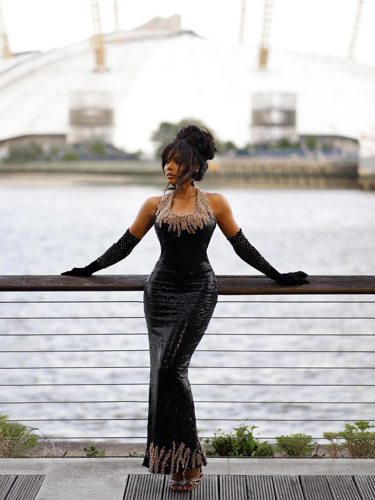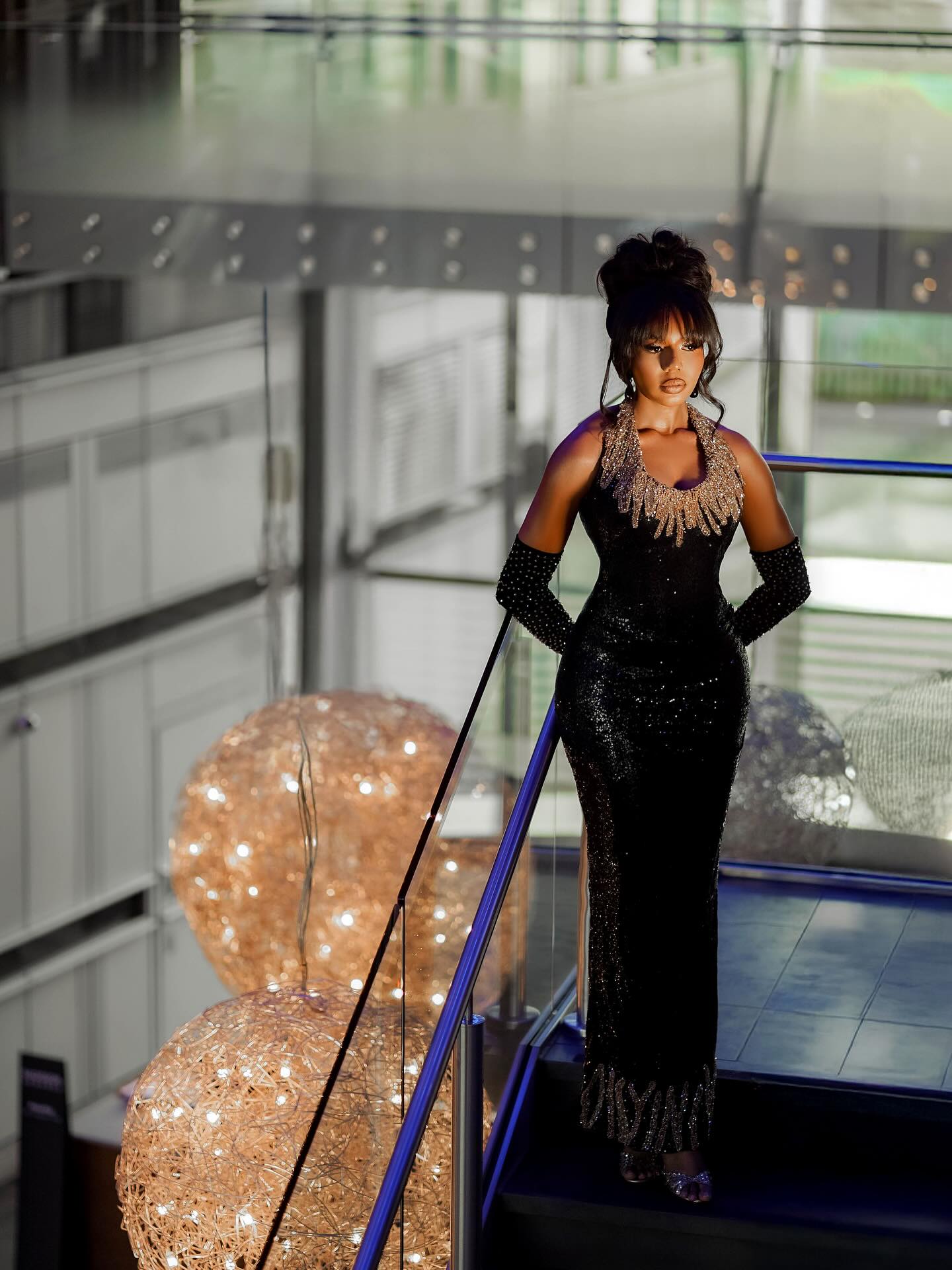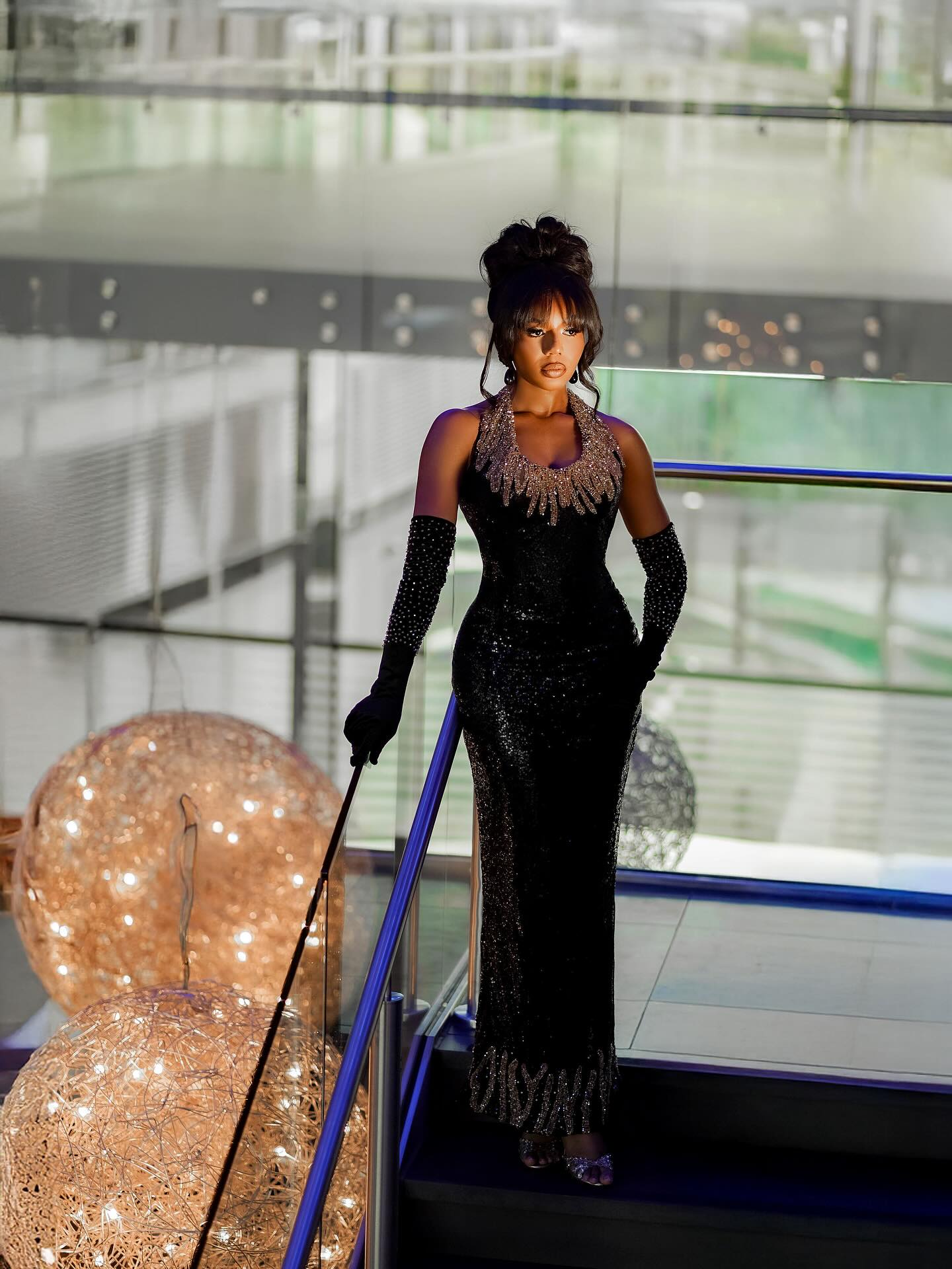Nancy Isime took London by storm for the “Radio Voice” premiere, dripping elegance in a custom Oobiuku masterpiece. The Lagos-based bridal fashion brand, Oobiuku, outdid itself with a Black sequined halter-neck gown, beaded with gold embellishments that shimmered brighter than the Thames at night.