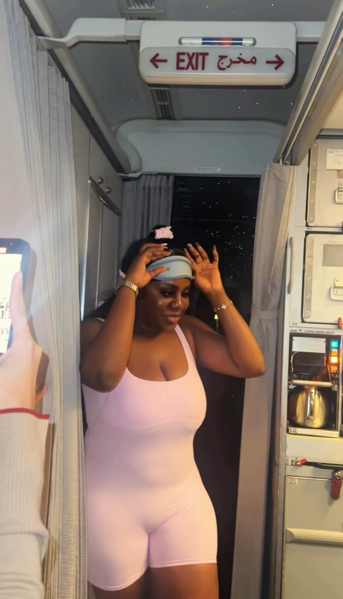 Nons Miraj, Nigeria’s viral comedy queen and actress, just redefined “birthday goals,” taking her party to 30,000 feet above sea level. The star, glowing in a pastel pink romper with cute hair bows, was spotted living her best life on a flight from Lagos to Dubai—champagne toasts, dollar bills, and all the luxury vibes.