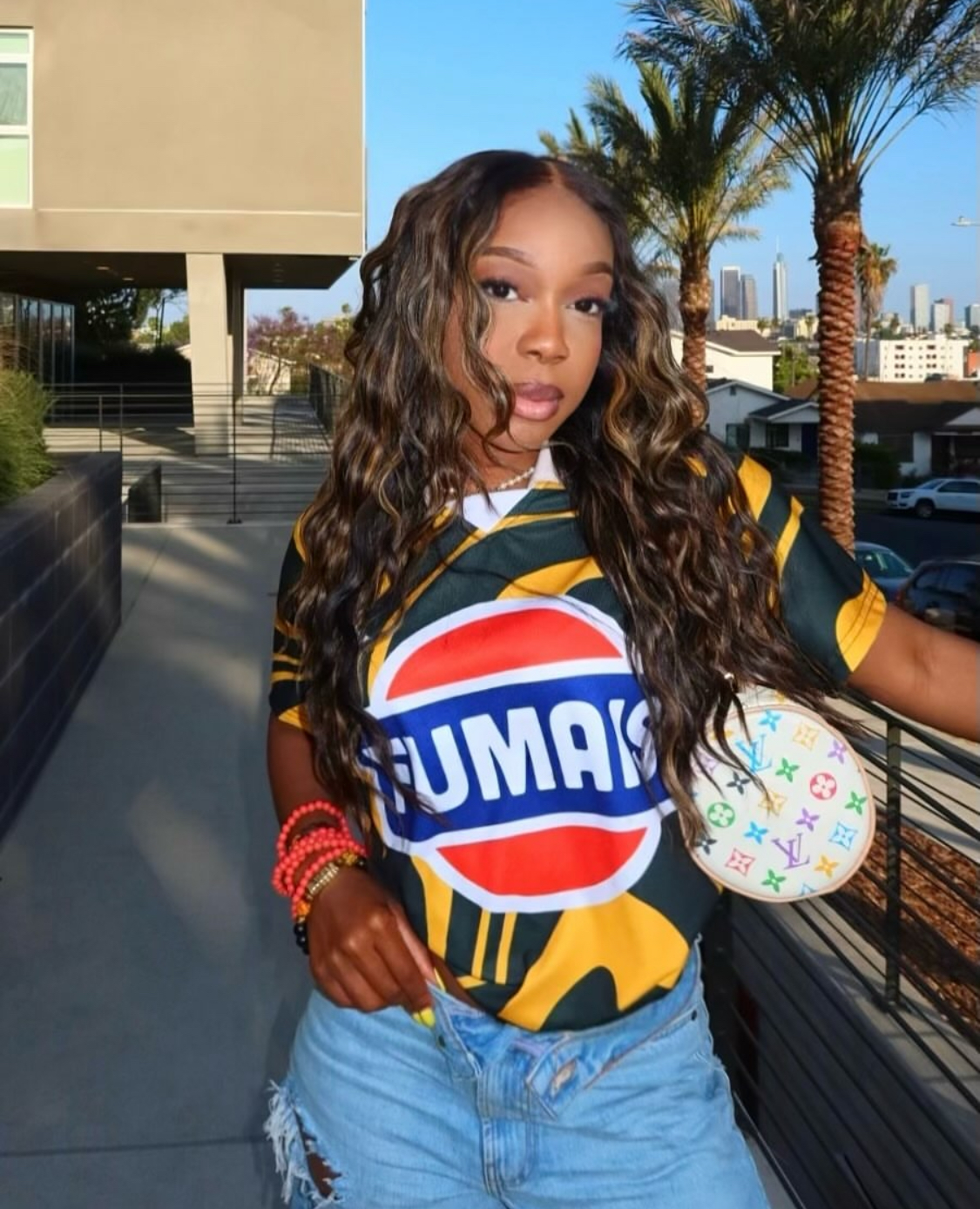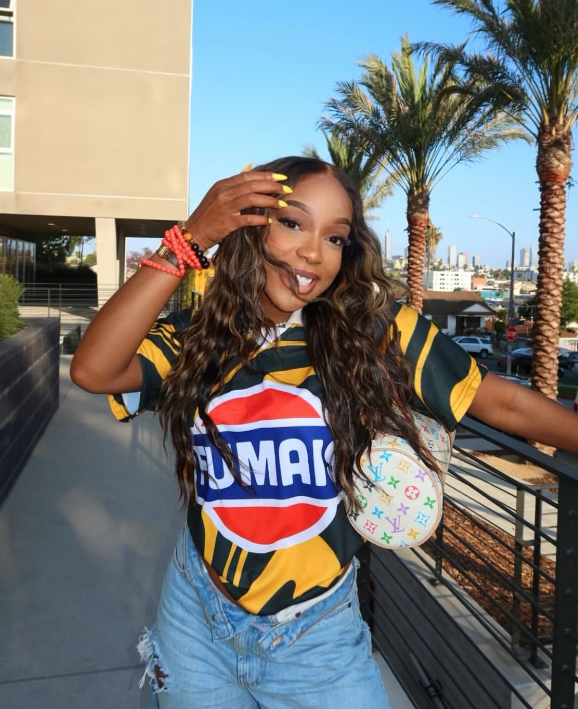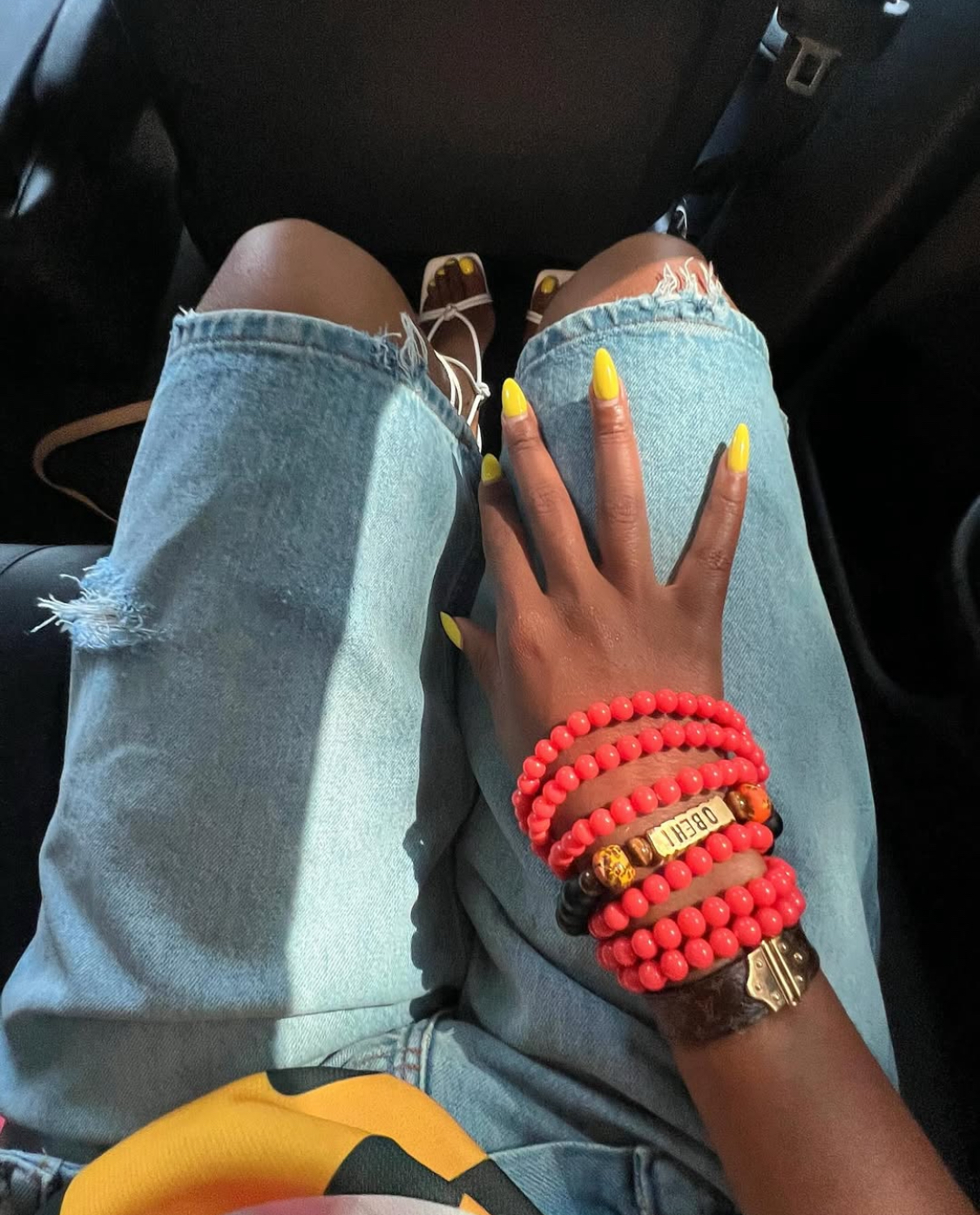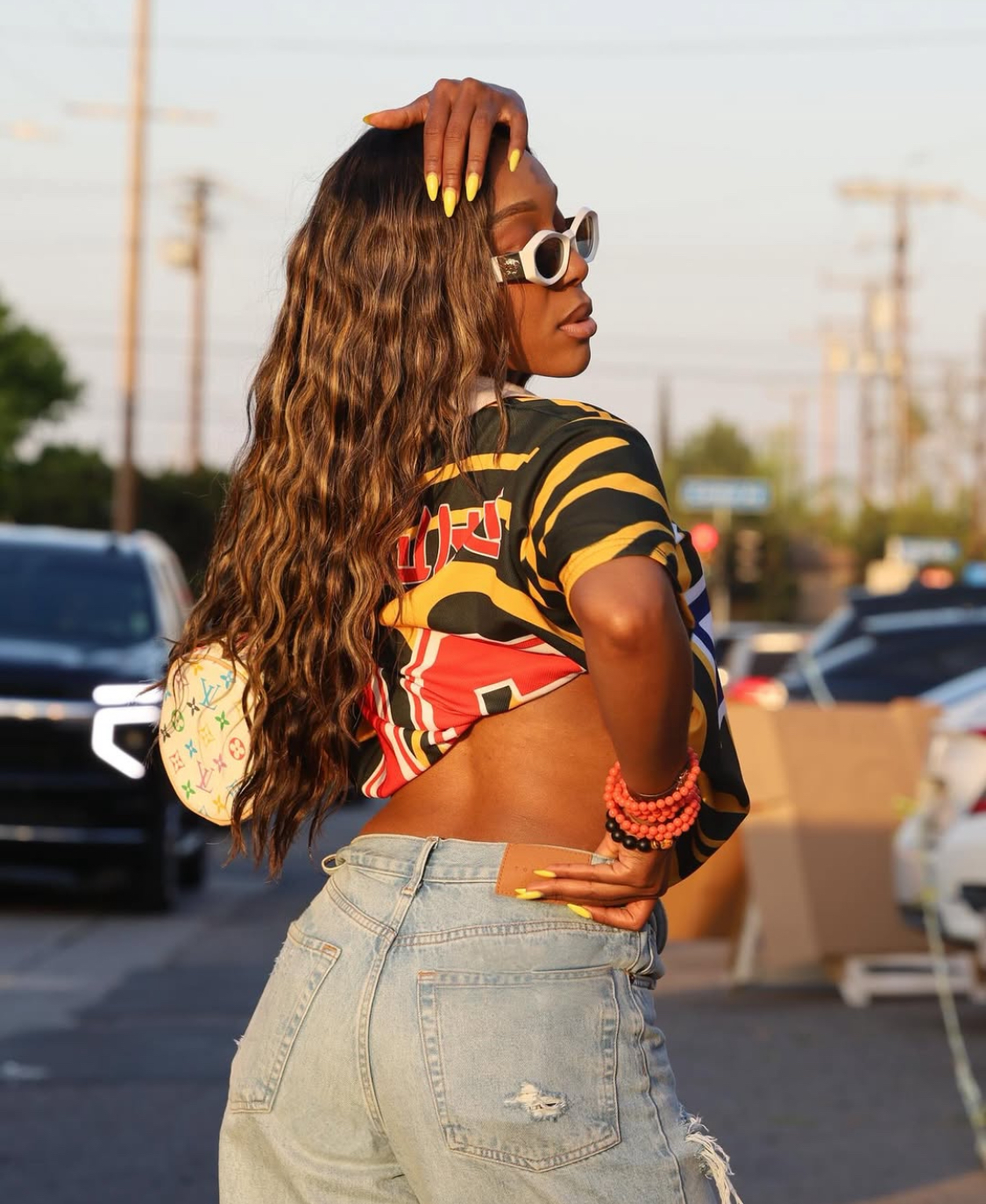 Obehi, dripping confidence and cool-girl vibes, shared a photo series that’s got LA talking. She rocks ripped knee-length denim shorts paired with a bold, vintage-inspired jersey, white strappy heels, and a round Louis Vuitton purse slung over her shoulder. Accessories? Beaded coral bracelets (with her name “OBEHI” front and center) and sun-bright yellow nails. Her hair flows in big, bouncy curls, and in one shot she’s seen in the golden California sunset, sunglasses on, jeans rolled up, ready to conquer any boulevard.