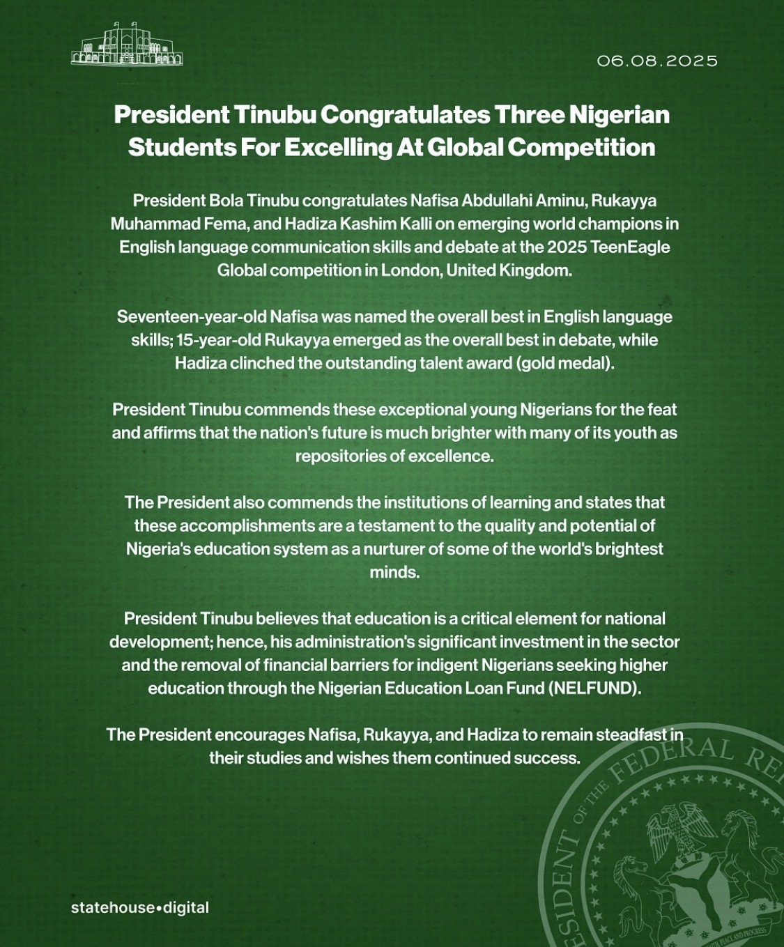 President Bola Tinubu has congratulated three young Nigerians — Nafisa Abdullahi Aminu, Rukayya Muhammad Fema, and Hadiza Kashim Kalli — for their outstanding victory at the 2025 TeenEagle Global Competition held in London, United Kingdom.