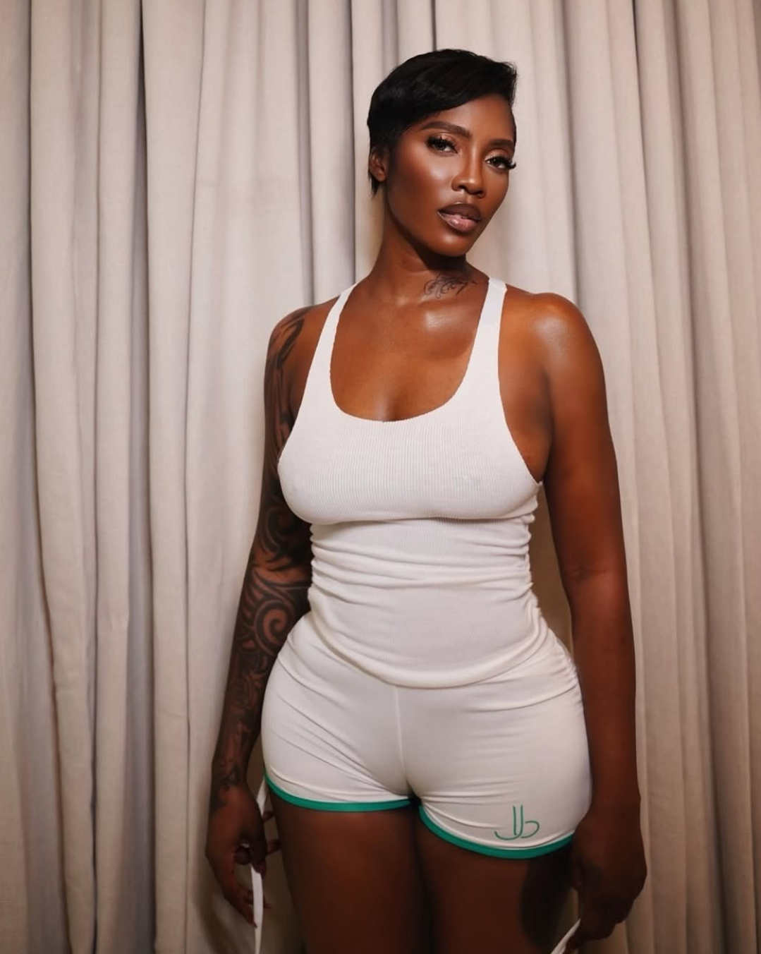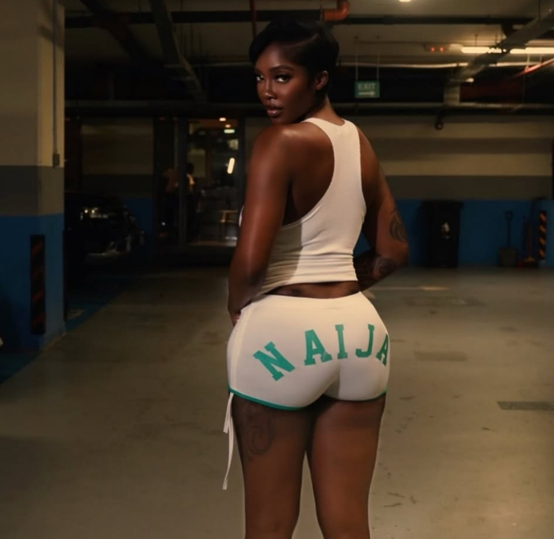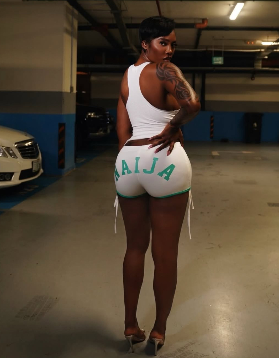 Tiwa Savage has set the internet ablaze with her latest look, serving body and national pride in a set of sleek, white “NAIJA” shorts and a matching tank.